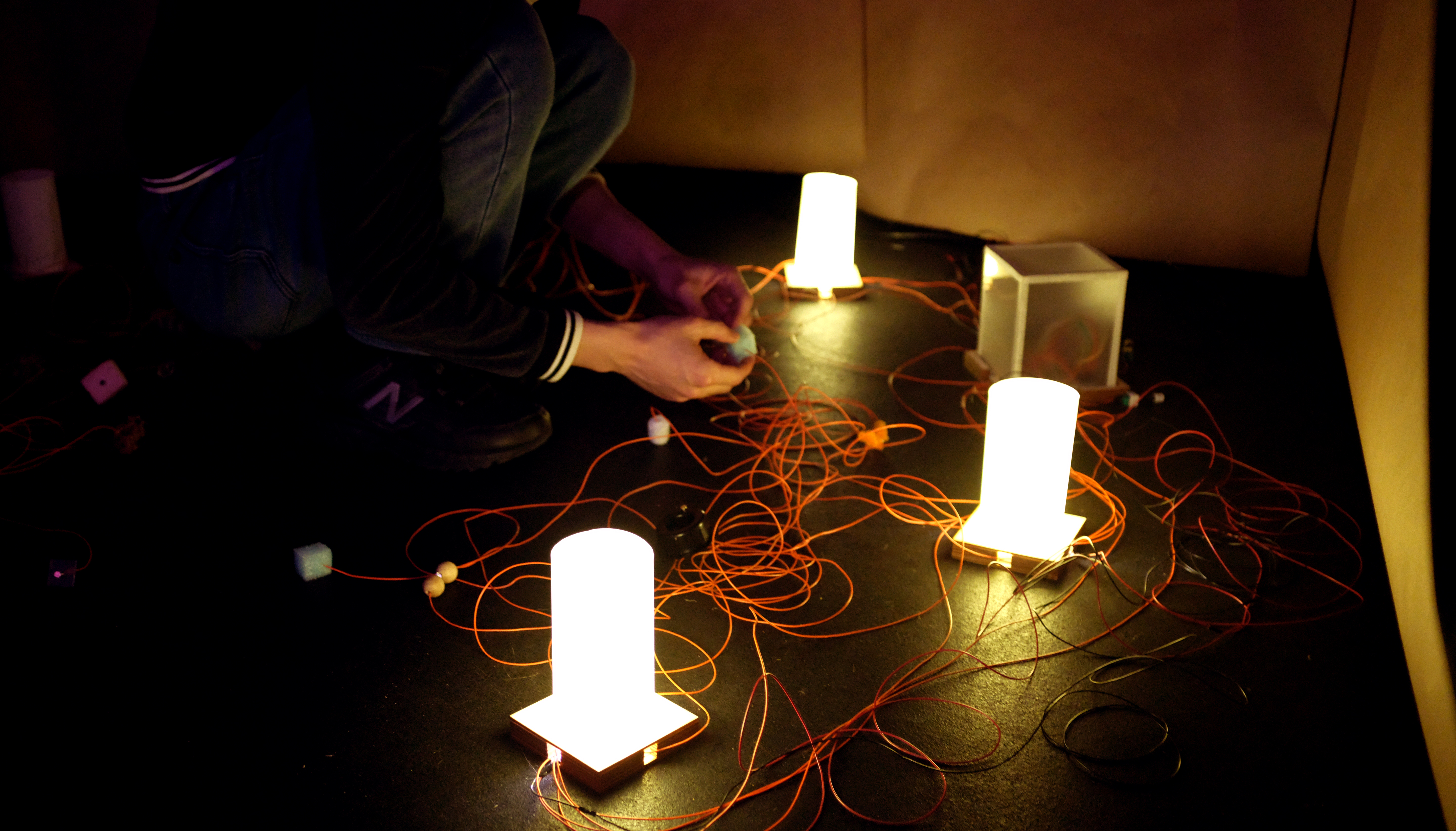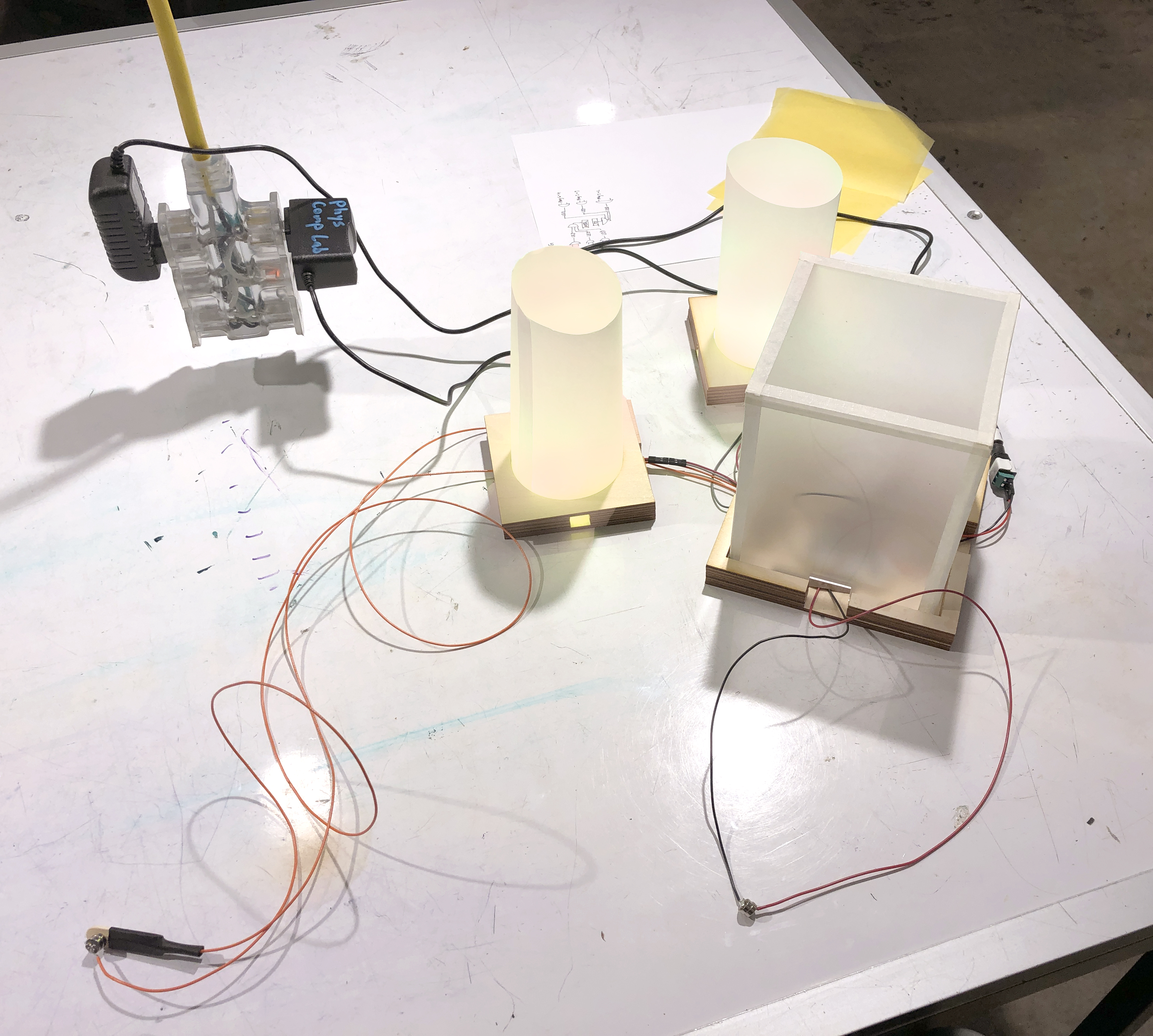 Users enter a dimly lit space with the goal to light up cylindrical paper lamps by matching the right wires together. Each wire is paired by having the same material on each end. Music could be activated if the user switches the correct lamp on and off quickly as a bonus feature.